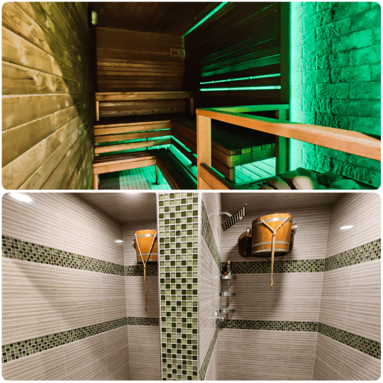 The facility includes two dry hot saunas (Banya) and two steam rooms. Banya is built from a natural cedar wood which is a perfect aromatherapy while you are enjoying the hot sauna. To cool yourself down, you can use a cold shower or a giant bucket full of cold water.
